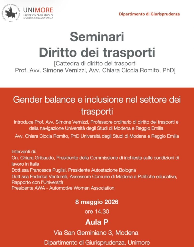 L’iniziativa si inserisce nell’ambito dei Seminari di Diritto dei trasporti e rappresenta un’importante occasione di confronto tra istituzioni, mondo accademico e stakeholder del settore su un tema sempre più centrale: la promozione dell’equilibrio di genere e dell’inclusione nel comparto dei trasporti.